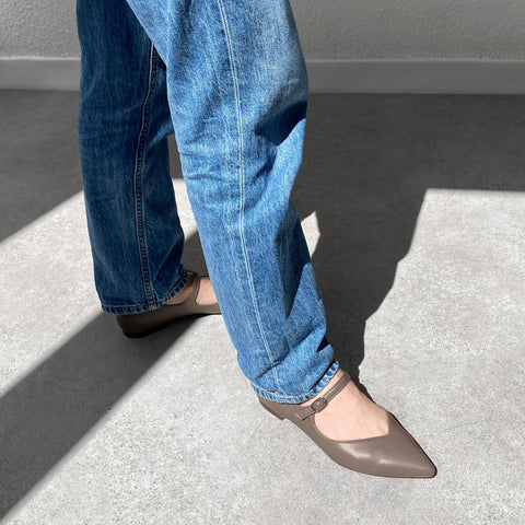 Pointed-toe flats with straps on the instep for an accent and adjustable fit. A simple pair that can be used in a wide range of situations, from work wear to private occasions.