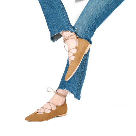 均一SALE:レースアップ ポインテッドトゥ フラットシューズ(130-16ss2)キャメルスエード