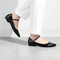 甲の高い位置(足首と甲の中間)にくるよう施されたストラップが新鮮な印象のポインテッドトゥフラットシューズ。華奢なストラップと浅めの甲カッティングが足を綺麗に見せてくれます。