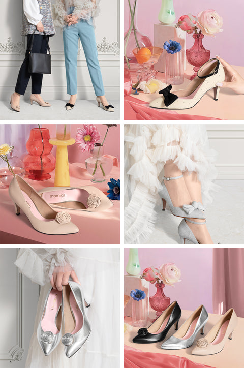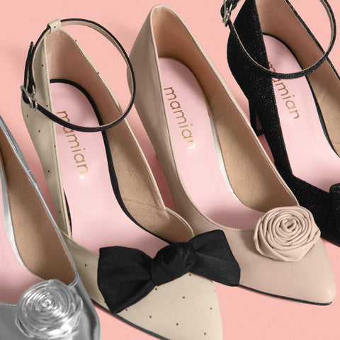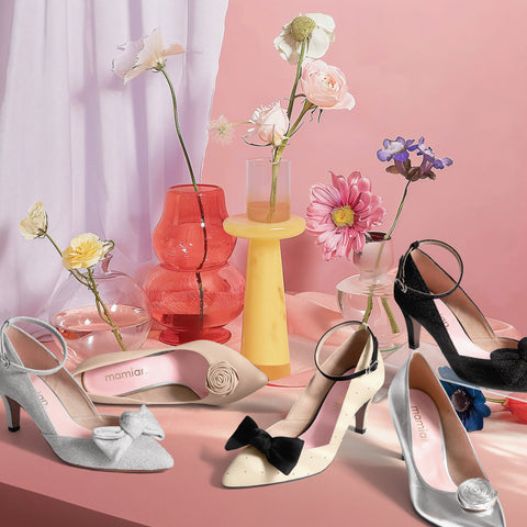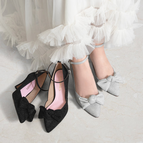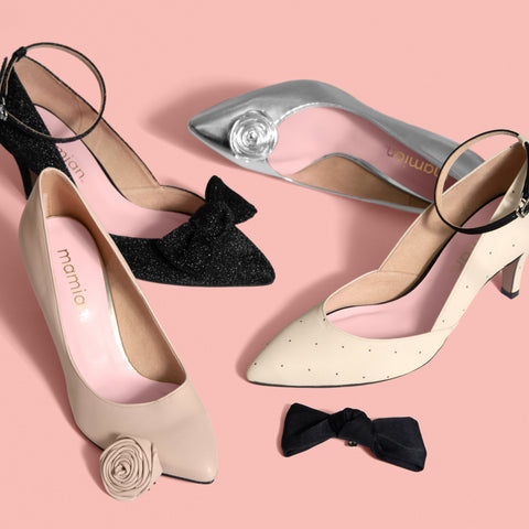 Ankle strap pumps with a large eye-catching ribbon. The V-cut on the side makes sure to show off your beautiful legs.